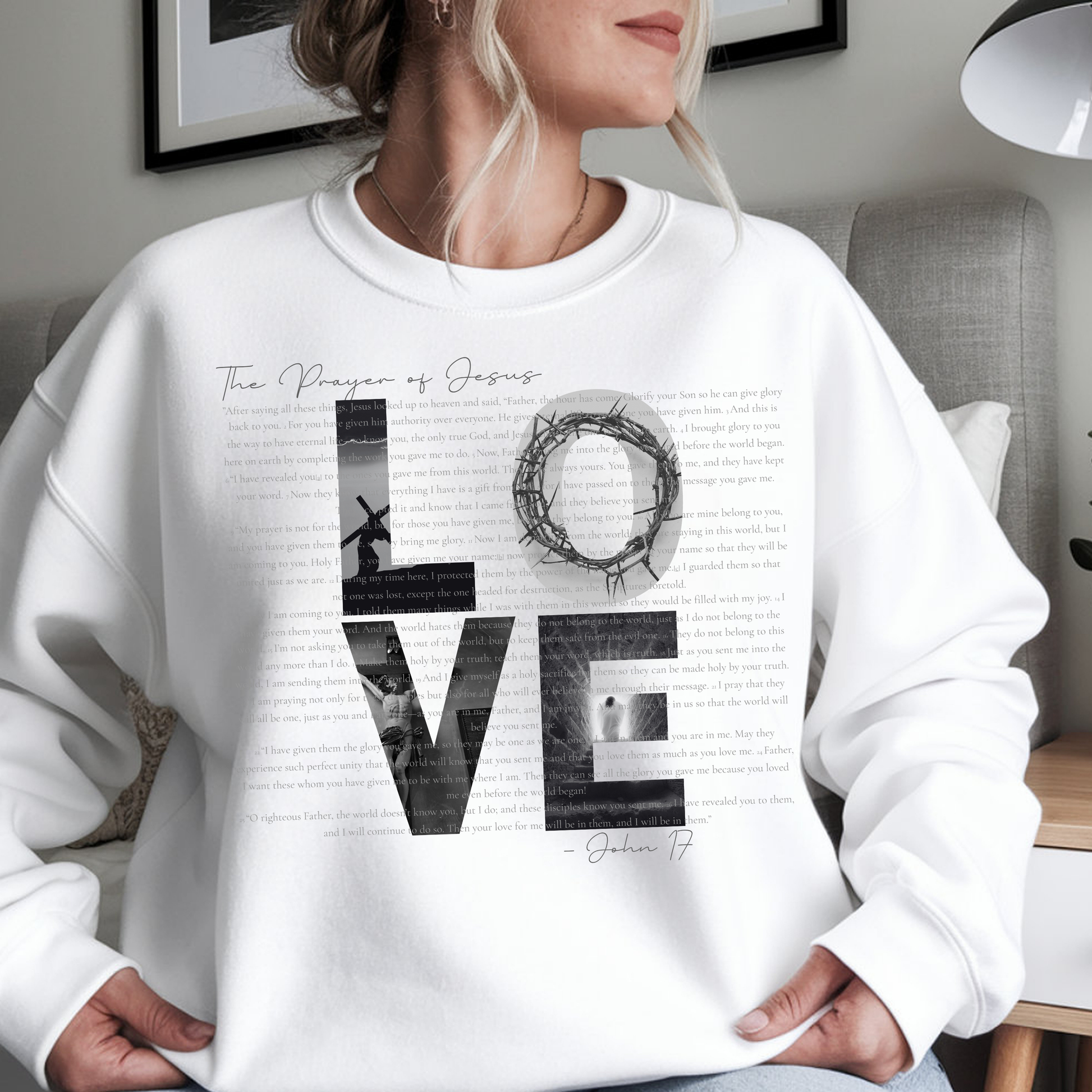 This beautifully designed sweatshirt features John 17 – The Prayer of Jesus softly layered behind the bold graphic word LOVE, with each letter symbolizing the sacrifice and heart of Christ: